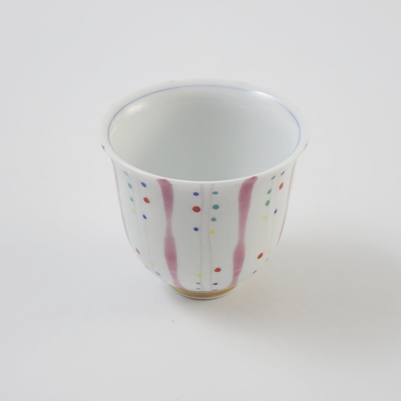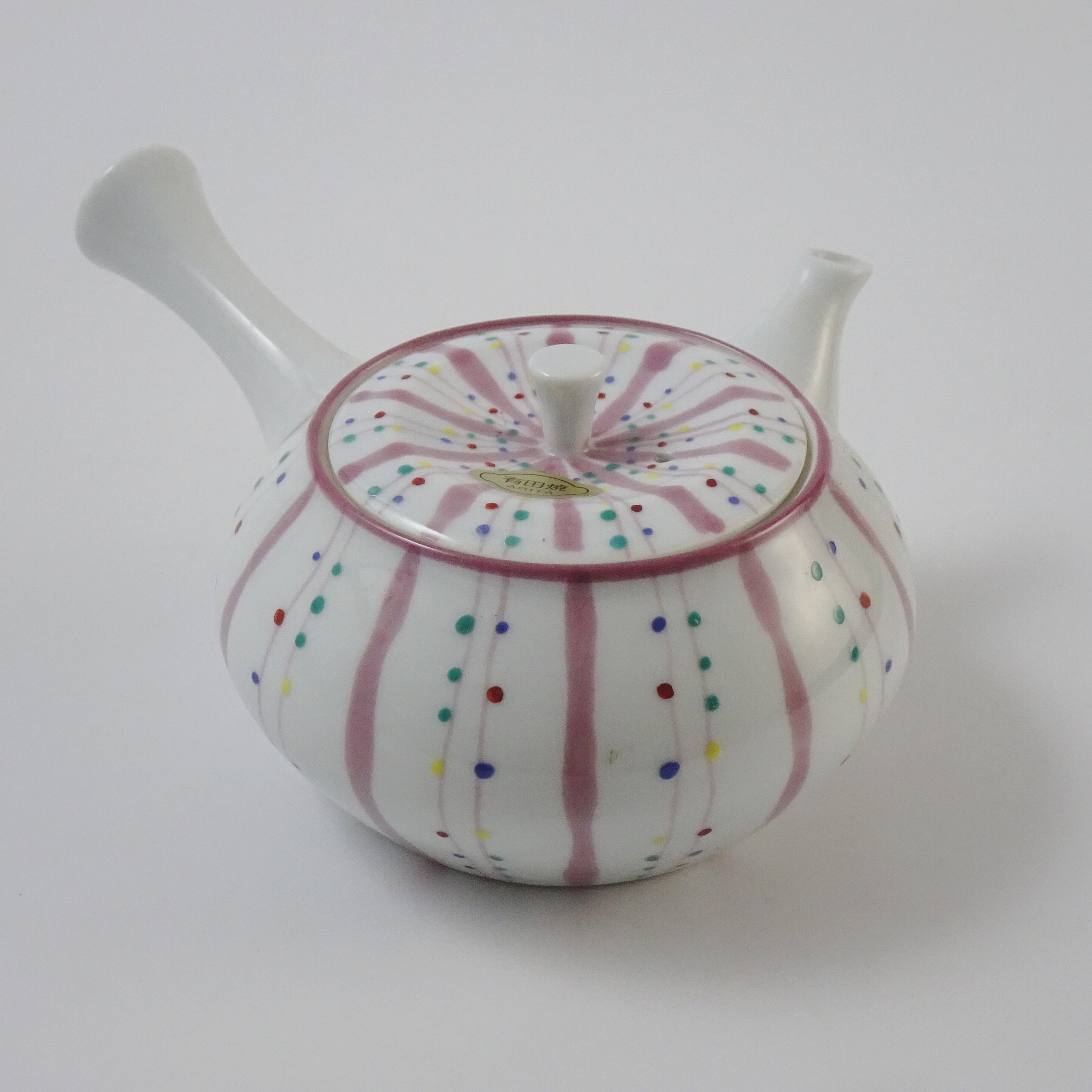この茶器セットは、銅の顔料を用いた釉裏紅と呼ばれる技法を使って紅色に発色させます。 釉裏紅は染付と同様に釉裏紅を下に絵付をして焼成する方法で、色が鮮烈で美しく、有田焼の技法の一つです。釉裏紅と水玉のデザインをお楽しみ下さい。