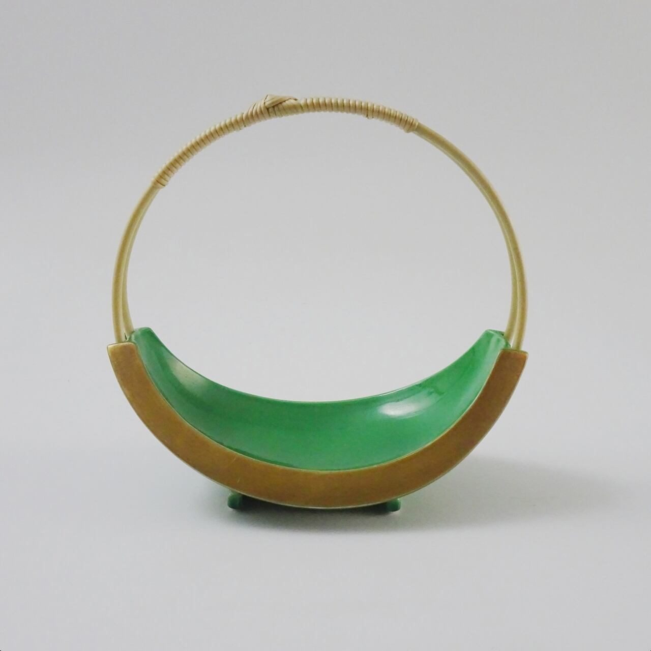 有田焼 錦右ェ門のグリーン金塗りの半月向付です。美しいグリーンの色合いと金塗りの華やかさが特徴で、刺身用としてまたサラダ盛・フルーツ盛等などにお使いいただけます。使い勝手が良く、日常使いはもちろん、特別なシーンにもぴったりです。器に金が施されていますので電子レンジでの使用は不可とさせて頂きます。丸型ツル付で化粧箱入での発送になります。